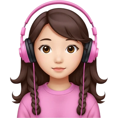 a asian japanese girl with wavy long silky brown hair and no bangs. the right side of hair is set on her shoulder she has a cute pink gaming headphones. she is wearing a cute pink sweater emoji