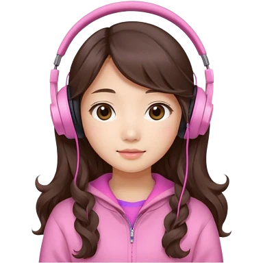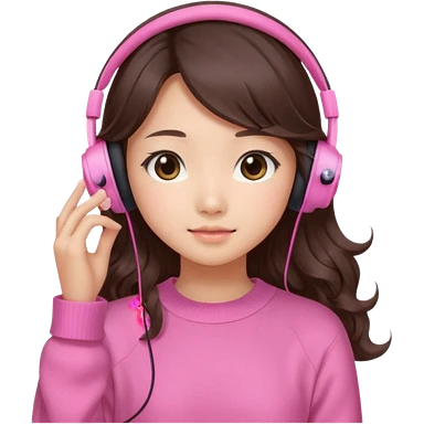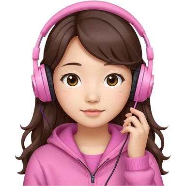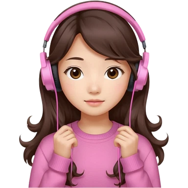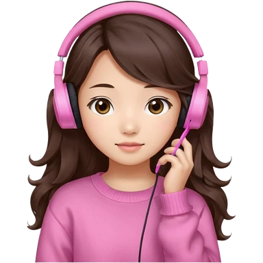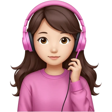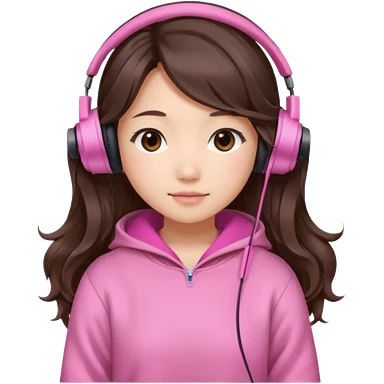 a asian japanese girl with wavy long silky brown hair and no bangs. she has a cute pink gaming headphones. she is wearing a cute pink sweater emoji