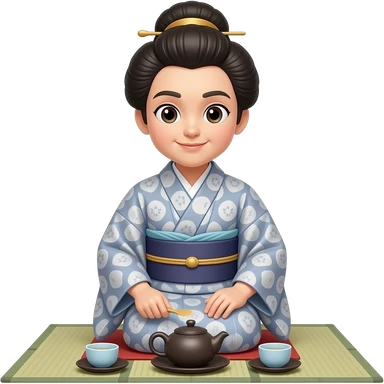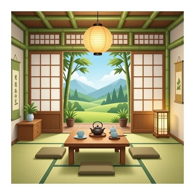 Small Japanese house with a blue tiled roof and a torii gate on an island a lake with two mountains behind it emoji
