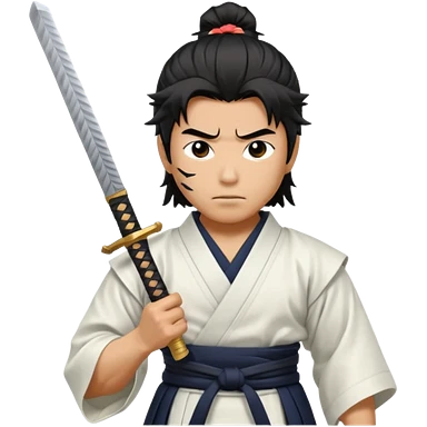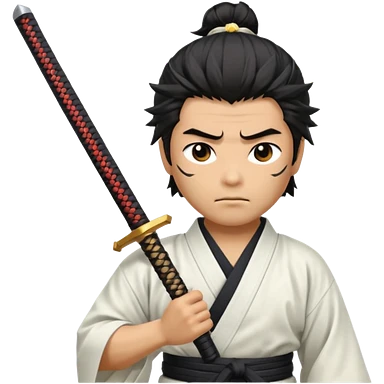 japanese samurai holding samurai sword he is wearing white kimono he has muscles and black messy hair emoji | AI Emoji Generator