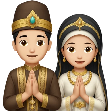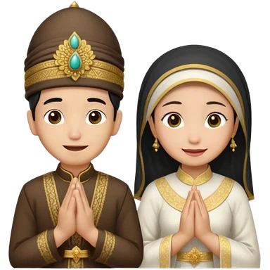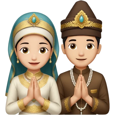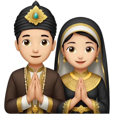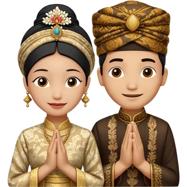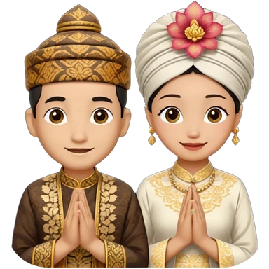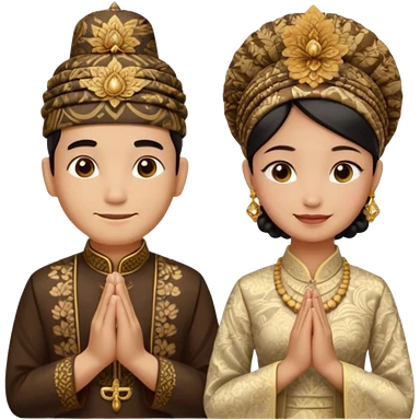 javanese person with shy smile (male) with batik blangkon hat and prayer hand, and also a javanese bride with sanggul or javanese classic updo and a shy smile emoji