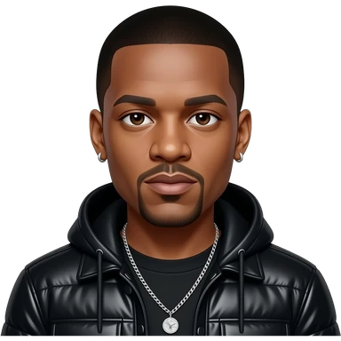 Jay-Z with dark brown eyes, black buzz cut hair, black metallic hip-hop outfit, necklace and earrings emoji