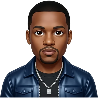 Jay-Z with dark brown eyes, black hair, dark blue metallic hip-hop outfit, necklace emoji