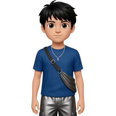 Jay from Kubz Scouts with brown eyes, black hair, indigo metallic t-shirt, charcoal metallic baggy pants, silver necklace emoji
