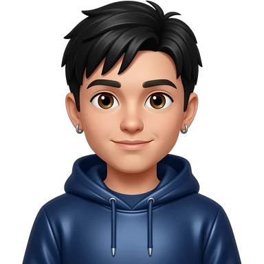 Jay from Kubz Scouts with brown eyes, black hair, dark indigo metallic sweatshirt, short earrings emoji