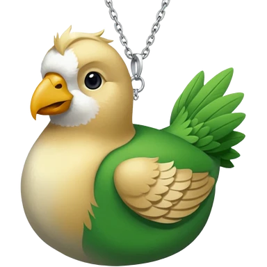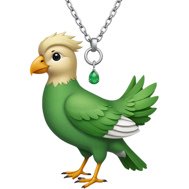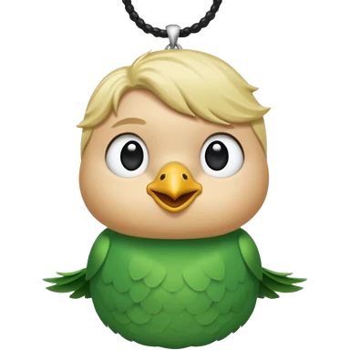 un oiseau classique tout vert avec un collier autour de son cou avec des breloque argentées et un seul poil blond qui fait une petite bouclette sur le front le collier est autour de son cou emoji