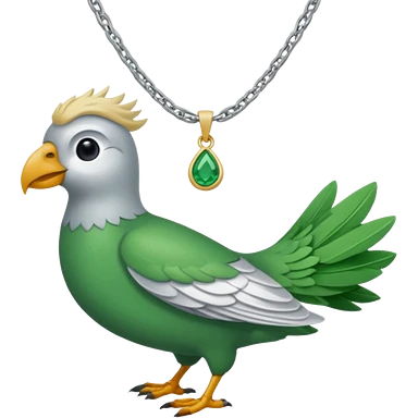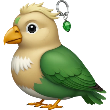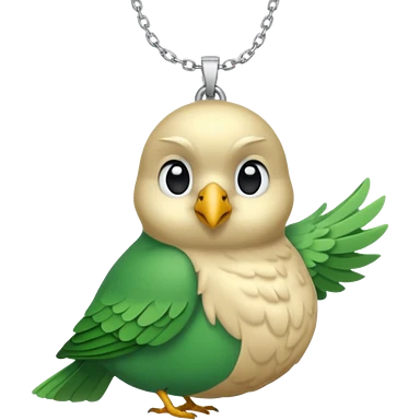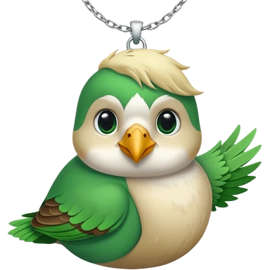 un oiseau classique vert avec un collier autour de son coup avec des breloque argentées et un seul poil blond qui fait une petite bouclette sur le front emoji
