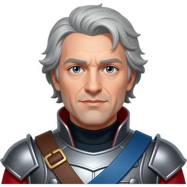 Jean Valjean from Les Mis with gray eyes, light gray hair, red and dark blue metallic outfit emoji