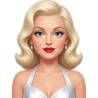 Jean Harlow with blue eyes, platinum blonde hair, white eyeshadow, dark red lipstick, white metallic halter dress, silver earrings emoji | AI Emoji Generator