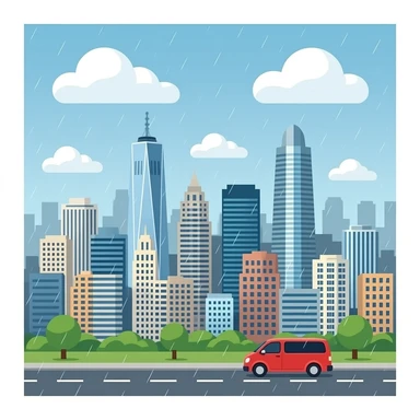 cheerful emoji-style girl with brown hair, pink fitted shirt, and light blue jeans, posing with one arm on a railing, city skyline and water behind her, sunny day emoji