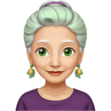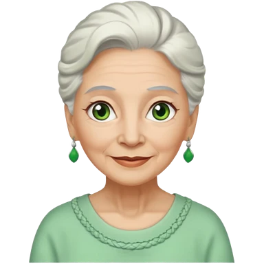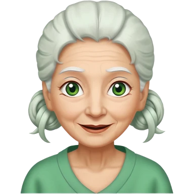 abuela con ojos verdes, pelo blanco, pelo blanco y amarrado, aspecto feliz emoji