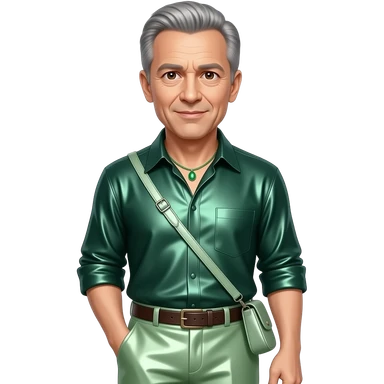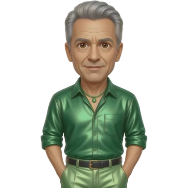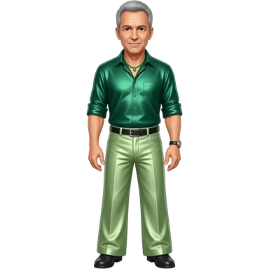Jeff Goldblum with brown eyes, silver hair, dark green metallic shirt, light green metallic wide leg pants, green necklace emoji