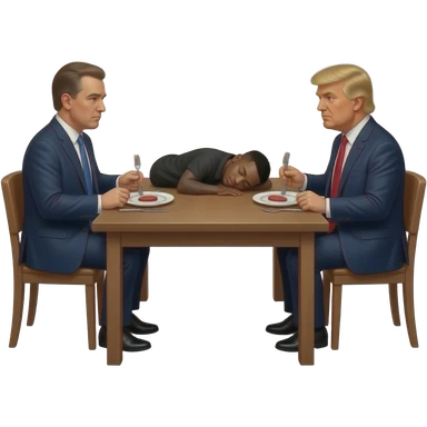jeffrey epstein and donald trump in a dark room, sitting at a table with two seats (one for each of them) and on the table is the rapper dababy (hes asleep on his back) and espstein and trump have plates forks knives with little red meat on it emoji
