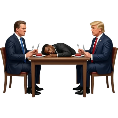 jeffrey epstein and donald trump in a dark room, sitting at a table with two seats (one for each of them) and on the table is the rapper dababy (hes asleep on his back) and espstein and trump have plates forks knives with little red meat on it emoji | AI Emoji Generator