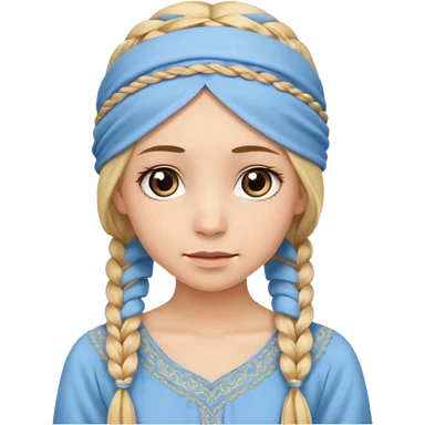 mujer, Joven, de aspecto dulce y elegante. Piel clara, ojos grandes y expresivos (pueden ser azules o verdes), sonrisa triste. Rubio o castaño claro, largo, con trenzas o velo. Vestido largo de tonos suaves (blanco, azul o lavanda), con bordados dorados; un manto o toca fina cubriendo la cabeza. emoji