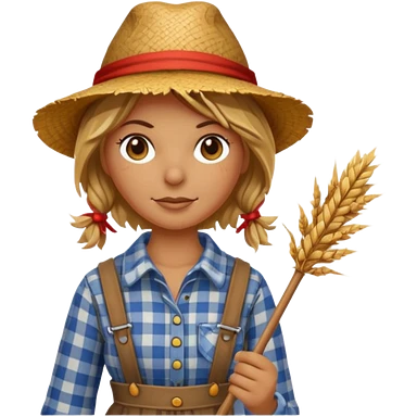 Scarecrow, Dressed like a farmer with overalls, straw hat, and a rake tucked in one arm, body on stick emoji