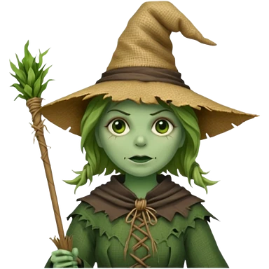 Scarecrow, Torn clothes, stitched mouth, glowing eyes, crow perched on shoulder. emoji
