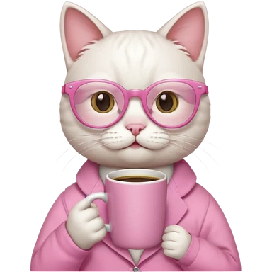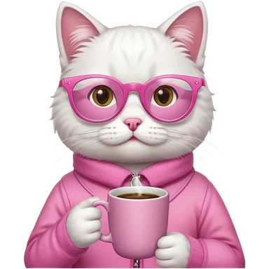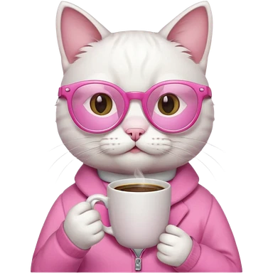 White cat, pink clothes and pink glasses, holding coffee mug emoji