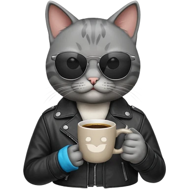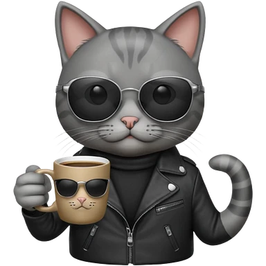 Gray cat, wearing sunglasses, leather black jacket, holding coffee mug emoji