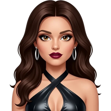 Jessica Sutta from The Pussycat Dolls with white skin, hazel eyes, long dark brown hair, black eyeshadow, dark red lipstick, black metallic halter dress, silver earrings emoji