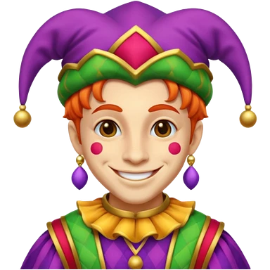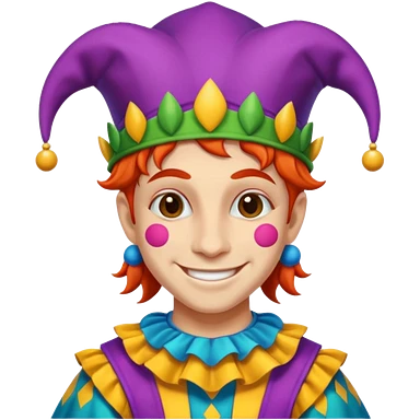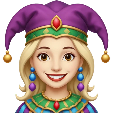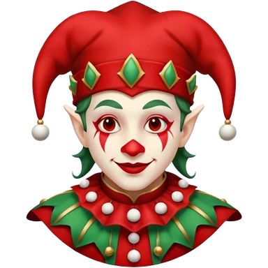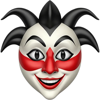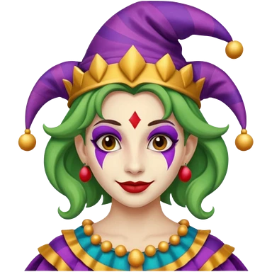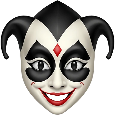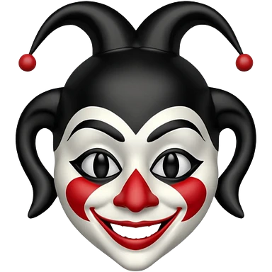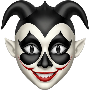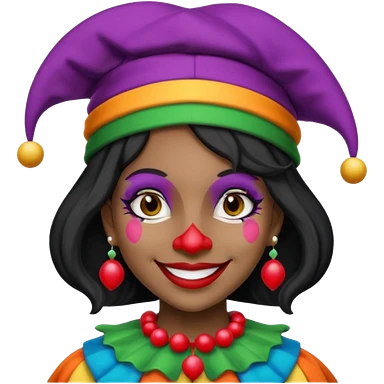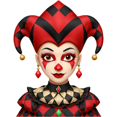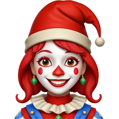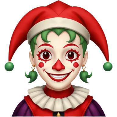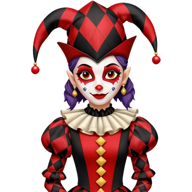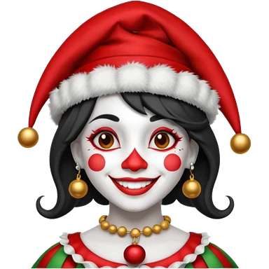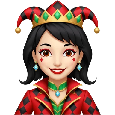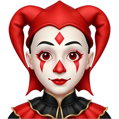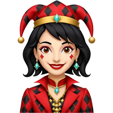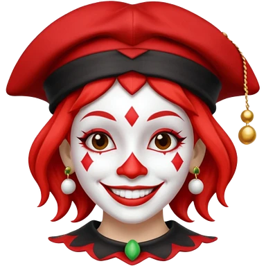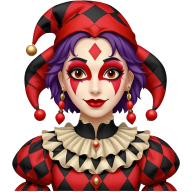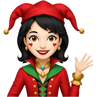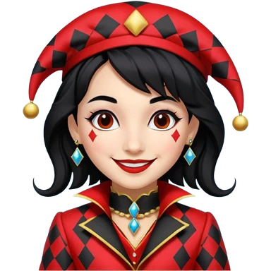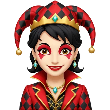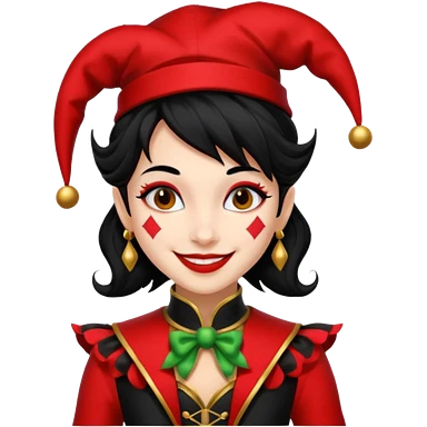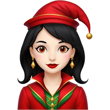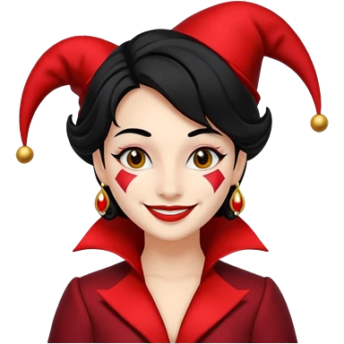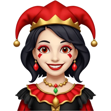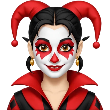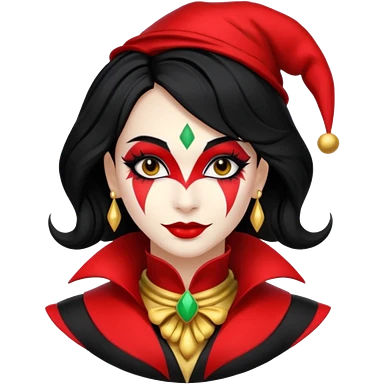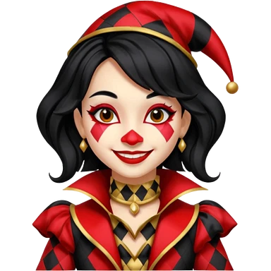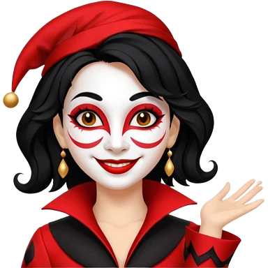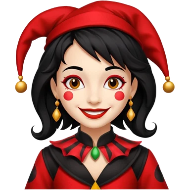 Jester woman, black and red suit, black hair, white and black make up emoji