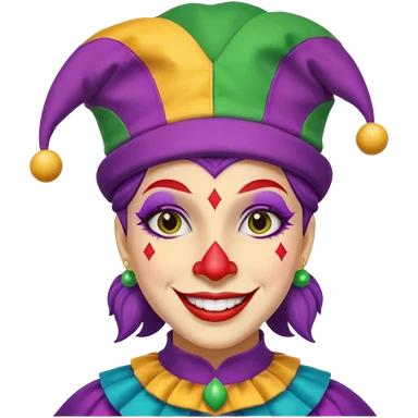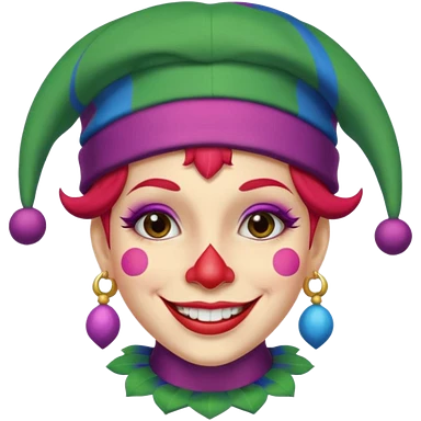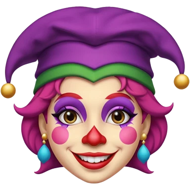 Minimalist emoji of a jester: round face, cheerful, wearing a classic three-point jester hat with bells emoji