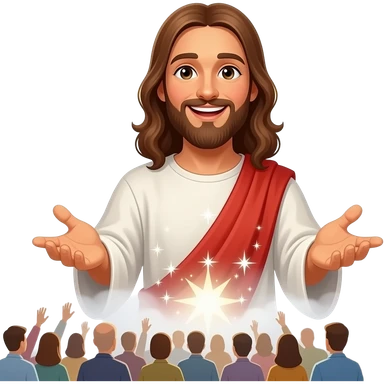 Jesus performing miracles with his hands which hold a mystical magic mist with sparkles and with a smile on his face And his hands stretched out on a crowd of people emoji