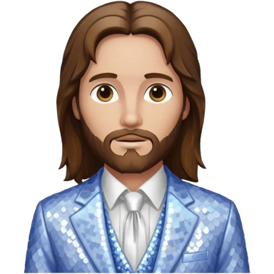Jesus Christ from Christian Mythology with long brown hair, white sequin suit jacket and tie, blue shirt emoji