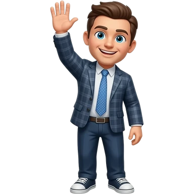 Number Five from "The Umbrella Academy": portrait of slim 16 yo teen (face, neck, shoulders, chest) in sarcastic pose, oval face with high cheekbones, gray eyes, dark brown wavy side-swept hair. Uniform: dark blue blazer with red trim, white shirt, black tie, diamond vest. emoji