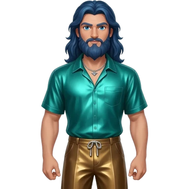 Poseidon from Greek Mythology with blue eyes, long dark blue hair, sea green metallic shirt, bronze metallic baggy pants, silver necklace emoji