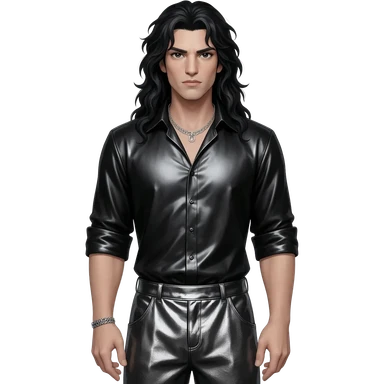 Hades from Greek Mythology with black eyes, long black hair, black metallic shirt, charcoal metallic baggy pants, silver necklace emoji
