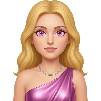 Aphrodite from Greek Mythology with pink eyes, long blonde hair, pink metallic one shoulder dress, silver necklace emoji