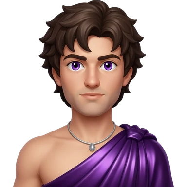 Dionysus from Greek Mythology with purple eyes, dark brown hair, deep purple metallic toga, silver necklace emoji