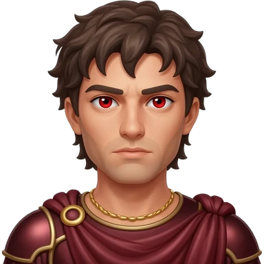 Ares from Greek Mythology with red eyes, dark brown hair, dark red metallic toga, gold necklace emoji