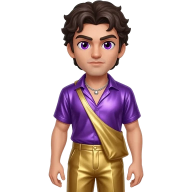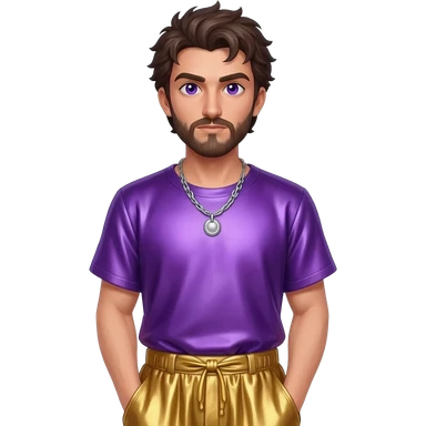 Dionysus from Greek Mythology with purple eyes, dark brown hair, purple metallic shirt, gold metallic baggy pants, silver necklace emoji