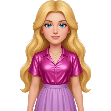 Aphrodite from Greek Mythology with blue eyes, long blonde hair, hot pink metallic sweetheart shirt, lavender pink long skirt, silver necklace emoji