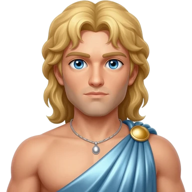 Zeus from Greek Mythology with blue eyes, long blonde hair, light steel blue metallic toga, silver necklace emoji