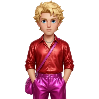 Eros from Greek Mythology with blue eyes, blonde hair, red metallic shirt, hot pink metallic baggy pants, silver necklace emoji