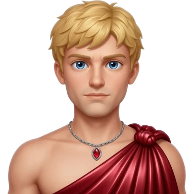 Eros from Greek Mythology with blue eyes, blonde hair, ruby red metallic toga, silver necklace emoji