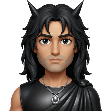 Hades from Greek Mythology with black eyes, long black hair, black metallic toga, silver necklace emoji