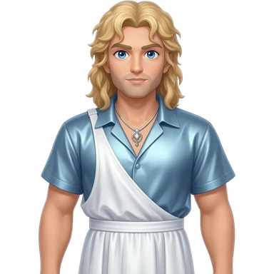 Zeus from Greek Mythology with blue eyes, long blonde hair, light steel blue metallic shirt, white metallic baggy pants, silver necklace emoji