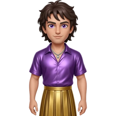 Dionysus from Greek Mythology with purple eyes, dark brown hair, purple metallic shirt, gold metallic long skirt, silver necklace emoji