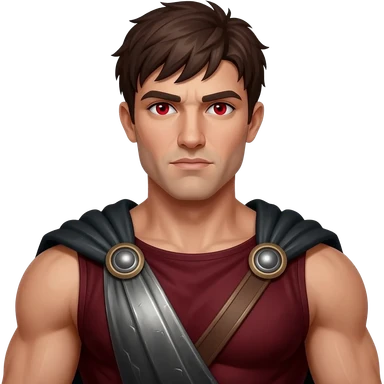 Ares from Greek Mythology with red eyes, dark brown hair, dark red metallic tunic, black metallic toga emoji