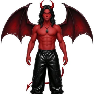 Satan from Christian Mythology with red skin, red eyes, long black hair, black vinyl baggy pants, shirtless with black necklace emoji