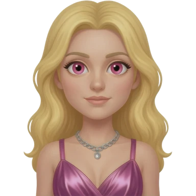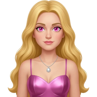 Aphrodite from Greek Mythology with pink eyes, long blonde hair, pink metallic coal dress, silver necklace emoji