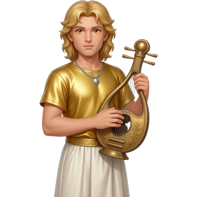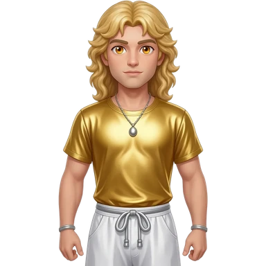 Apollo from Greek Mythology with amber eyes, long blonde hair, gold metallic shirt, ivory metallic baggy pants, silver necklace emoji