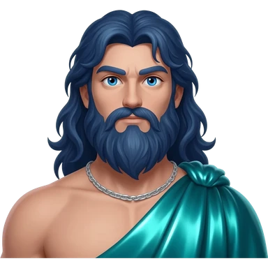 Poseidon from Greek Mythology with blue eyes, long dark blue hair, sea green metallic toga, silver necklace emoji