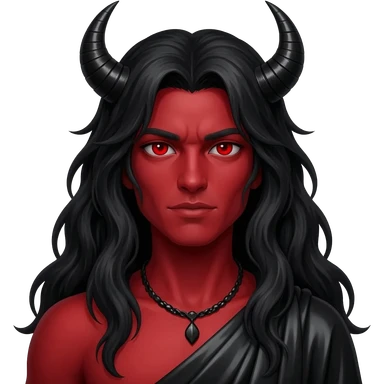 Satan from Christian Mythology with red skin, red eyes, long black hair, black metallic toga, black necklace emoji