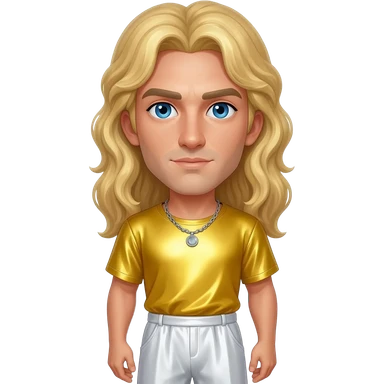 Apollo from Greek Mythology with blue eyes, long blonde hair, yellow metallic shirt, white metallic baggy pants, silver necklace emoji