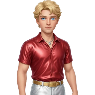 Eros from Greek Mythology with blue eyes, blonde hair, red metallic shirt, white metallic baggy pants, silver necklace emoji